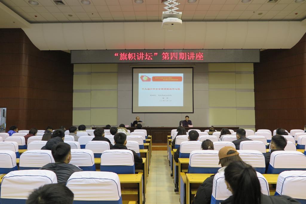 2021年12月16日下午,我校“旗帜讲坛”第四期讲座在秦皇岛校区学术交流中心举办,专题宣讲十九届六中全会精神。yl8858永利集团全体教师、体育与健康学院师生党员及学生入党积极分子等共100余人听取了讲座。